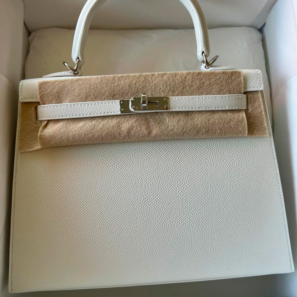Kelly 25 New White Epsom Palladium Hardware Stamp K