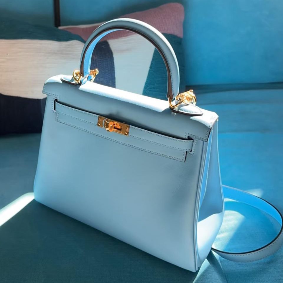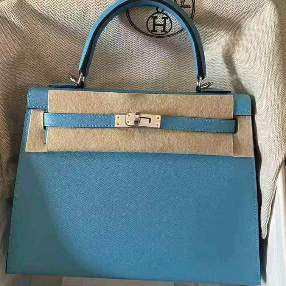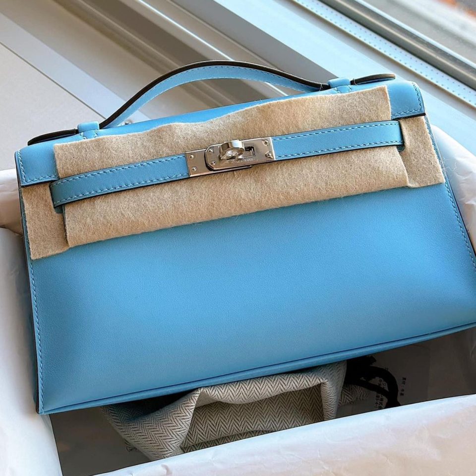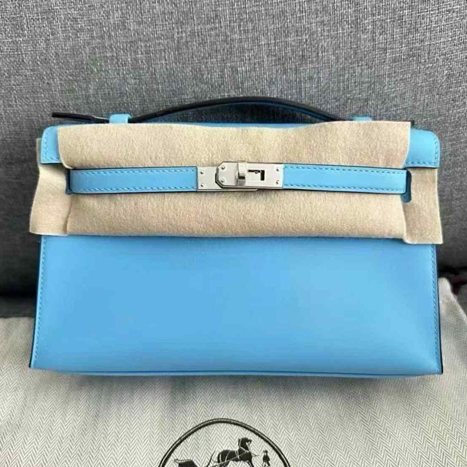 Kelly Pochette Blue Celeste Swift Palladium Hardware Stamp K