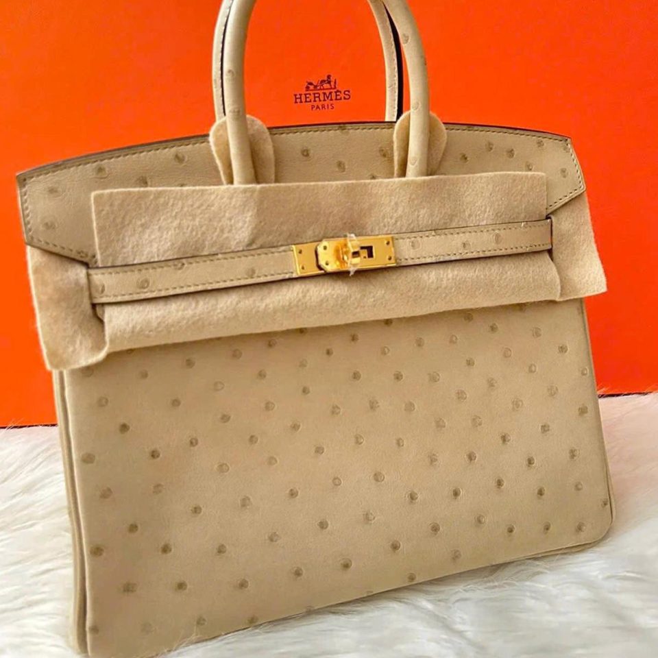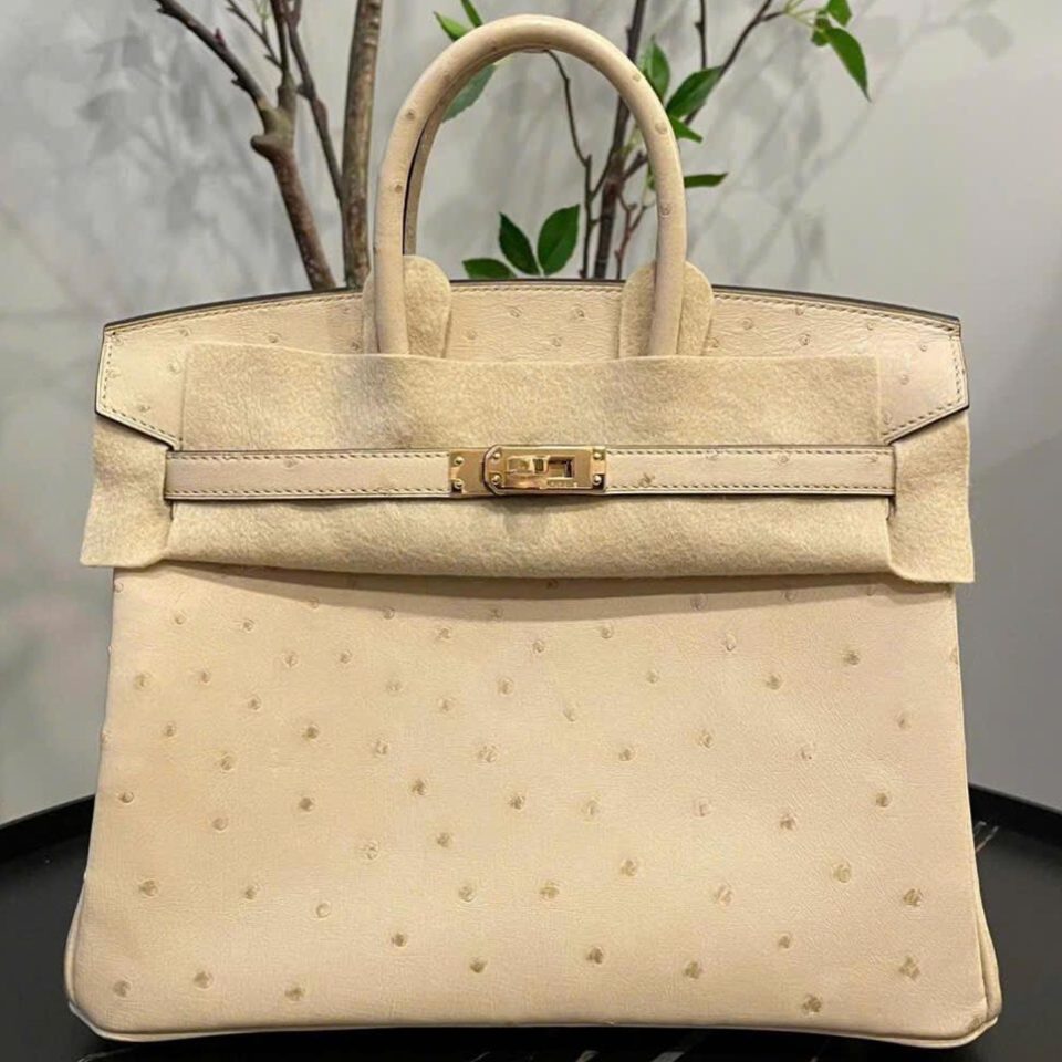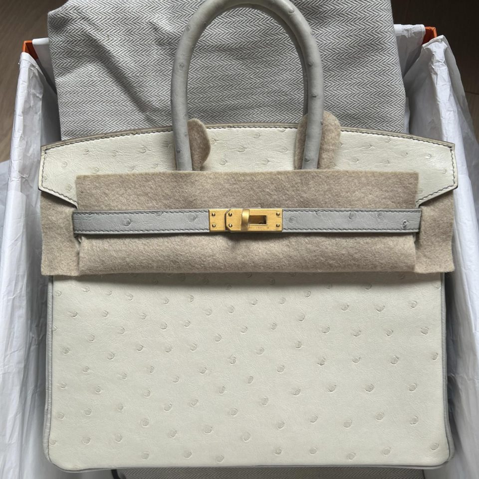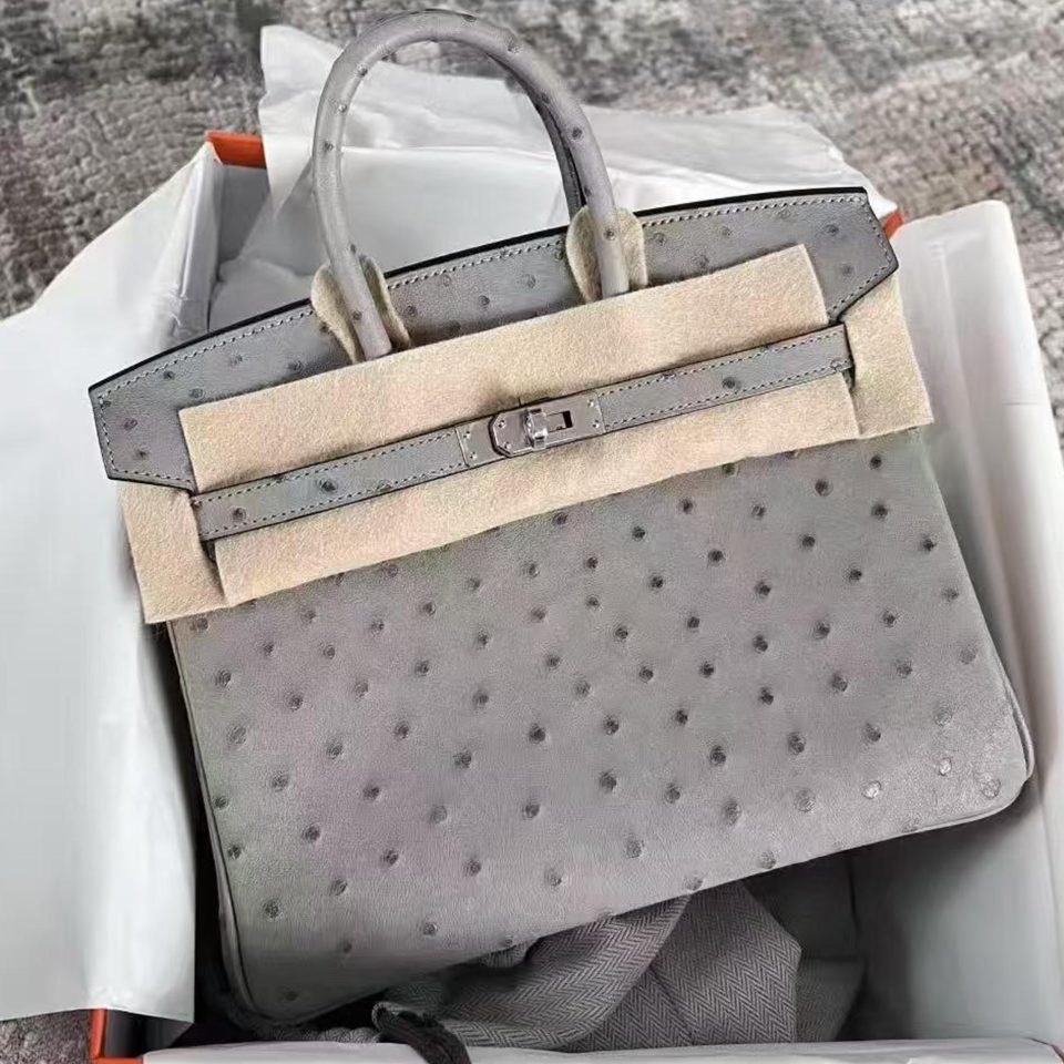 Birkin 25 HSS Gris Perle/Beton Ostrich Brushed Gold Hardware Stamp U