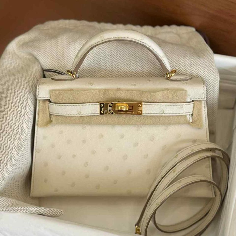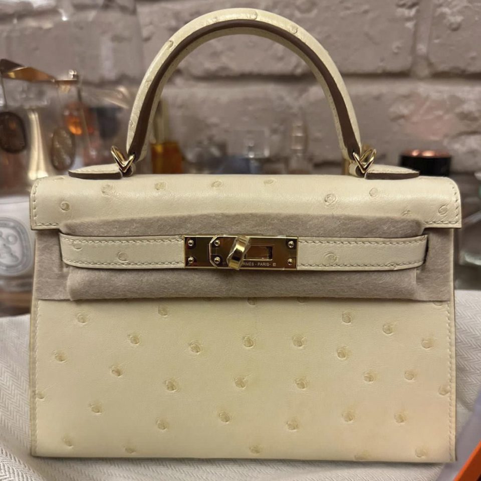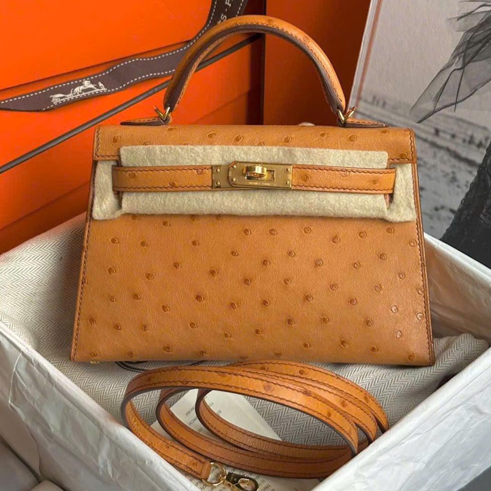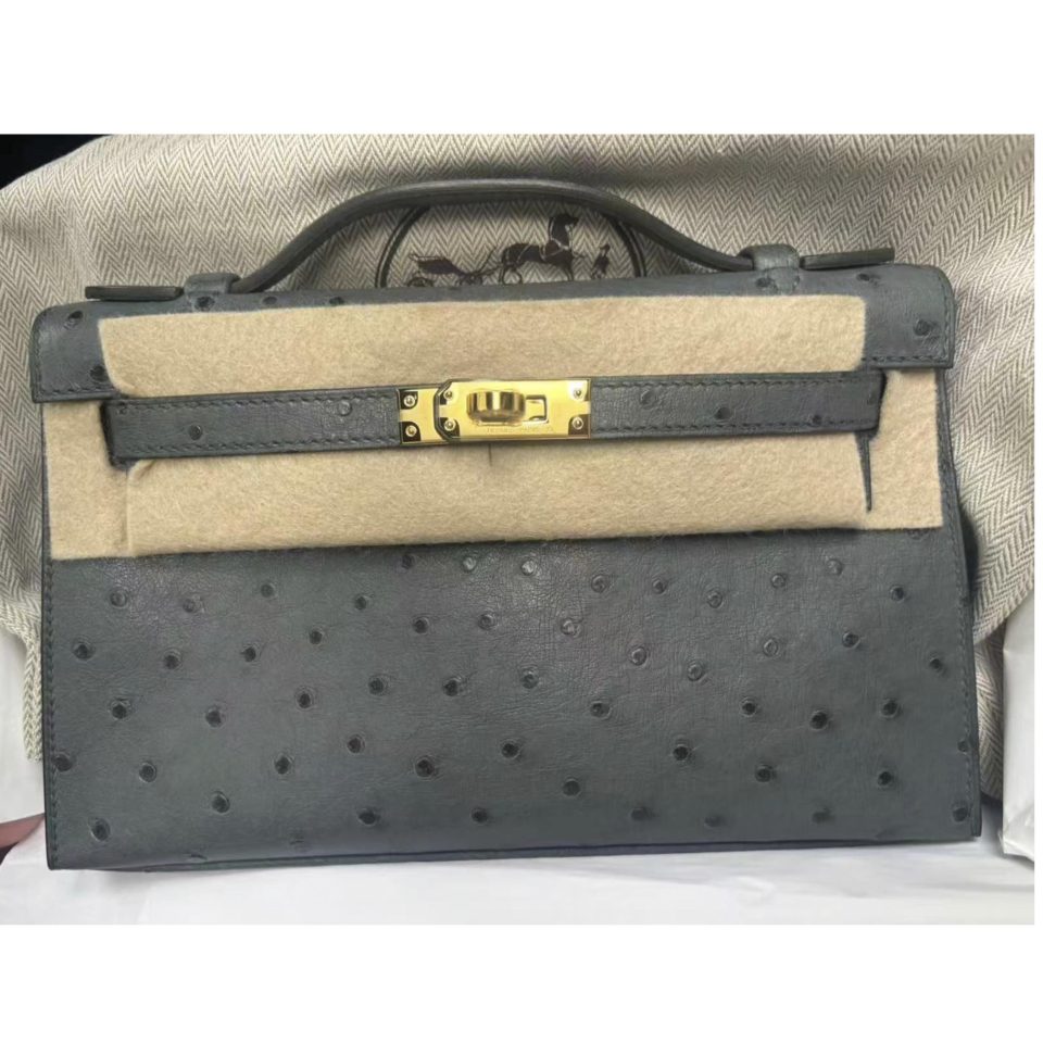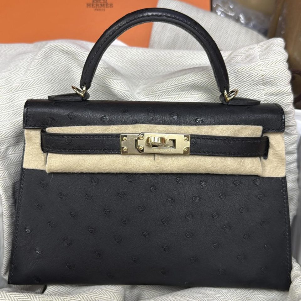 Kelly 20 Mini Black Ostrich Gold Hardware Stamp K