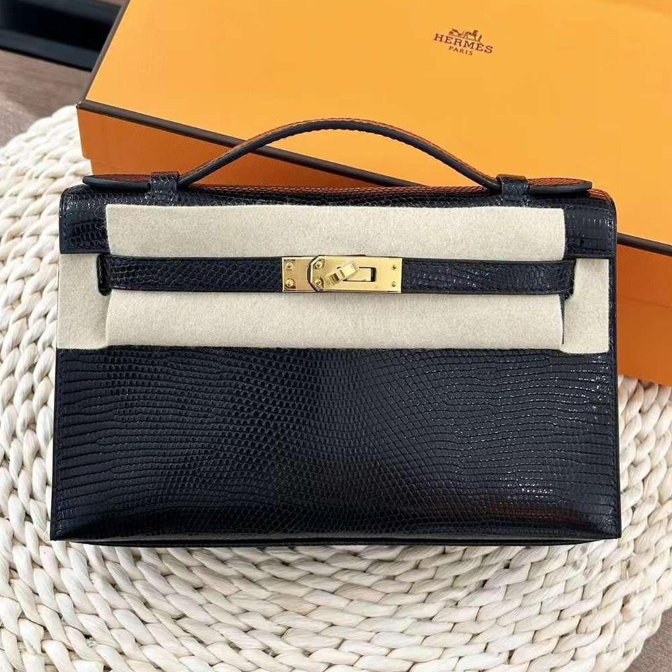 Kelly Pochette Black Lizard Palladium Hardware Stamp K