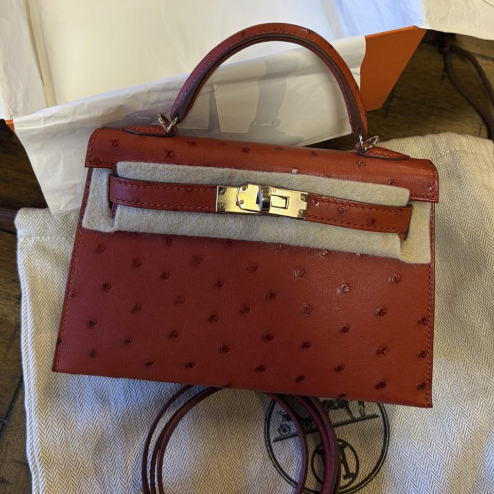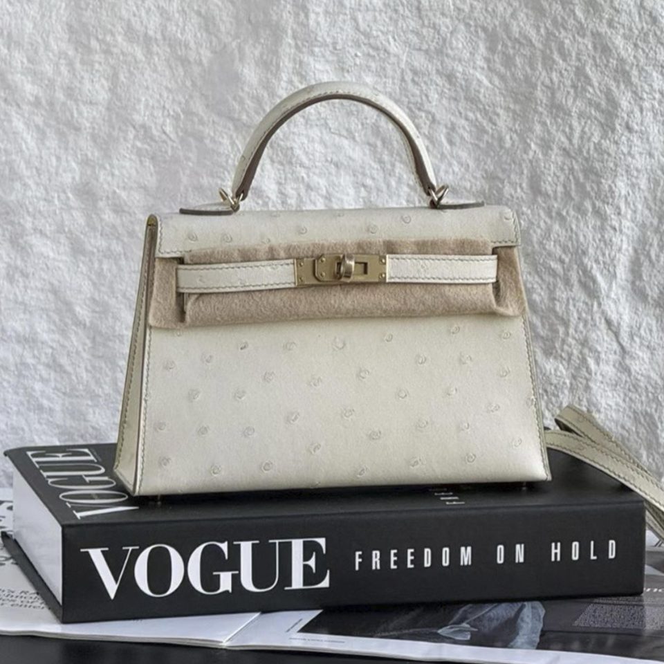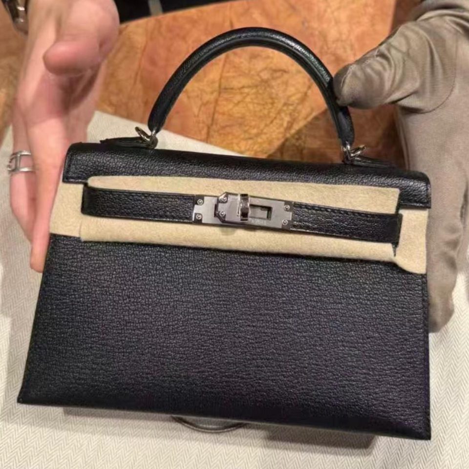 Kelly 20 Mini Black Ostrich Palladium Hardware Stamp K
