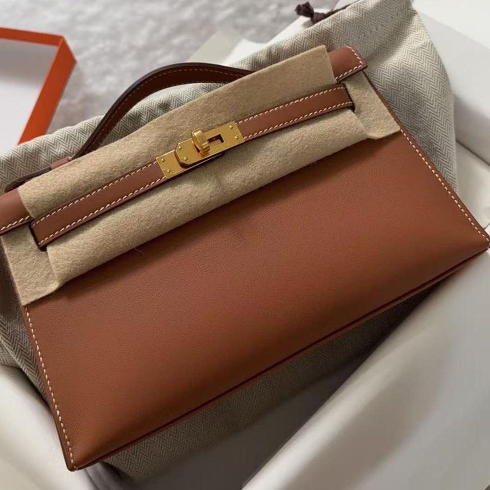Kelly Pochette Gold/White Stitching Gold Hardware Stamp K