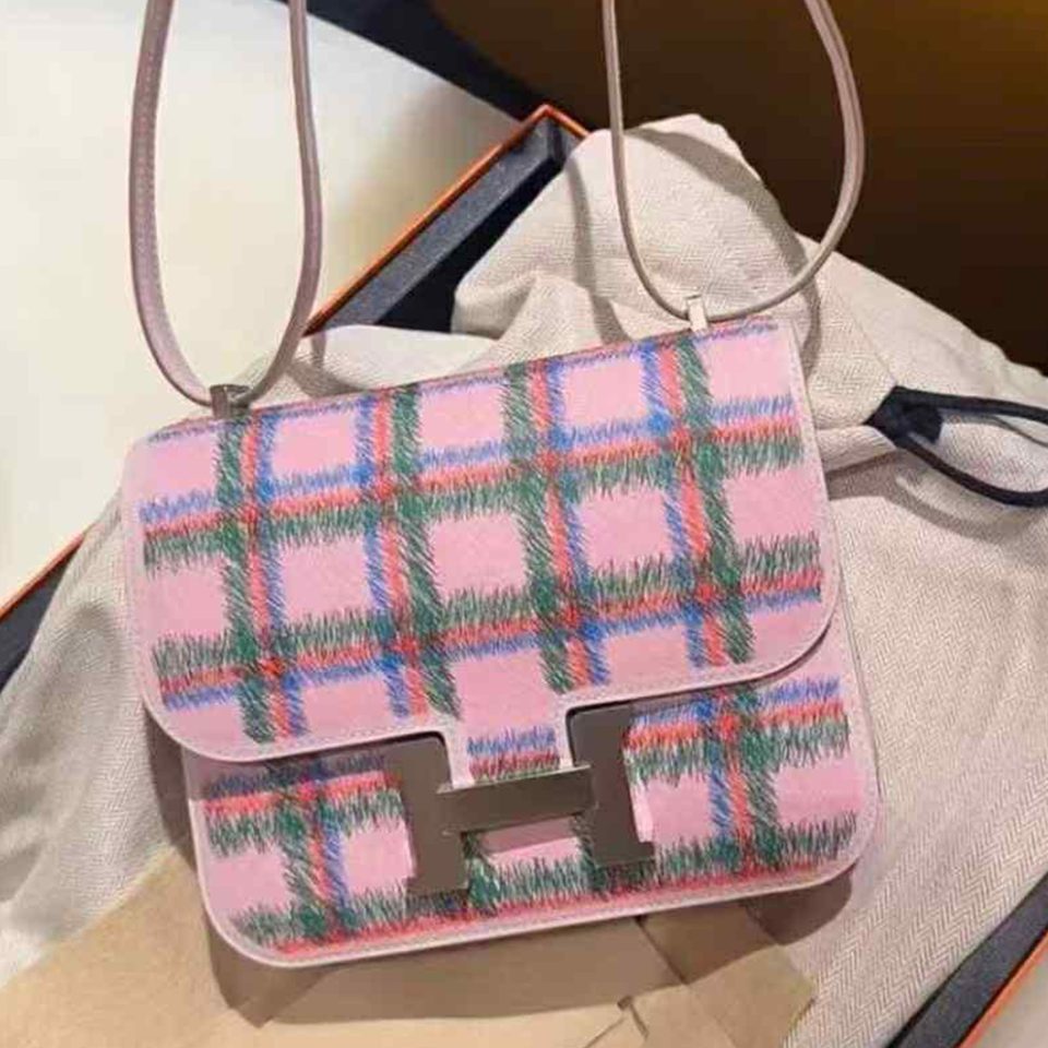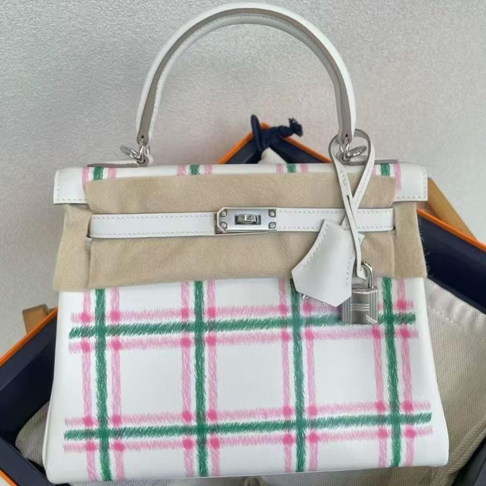 Kelly 25 Tartan Light Vert Moyen/Rose Bubblegum/Gris Pale Swift Palladium Hardware Stamp K