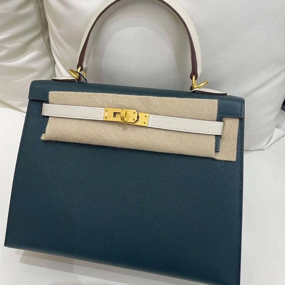 Kelly 25 HSS Vert Cypress/White Epsom Gold Hardware Stamp W