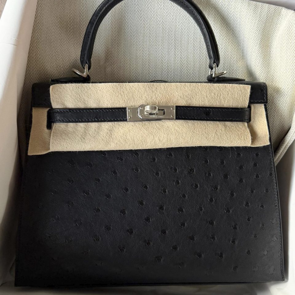 Kelly 25 Black Ostrich Palladium Hardware Stamp K