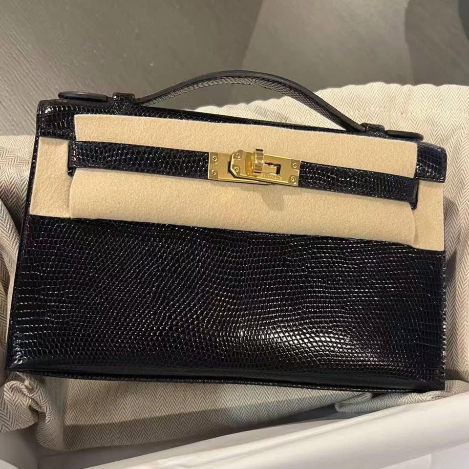 Kelly Pochette Black Lizard Gold Hardware Stamp K