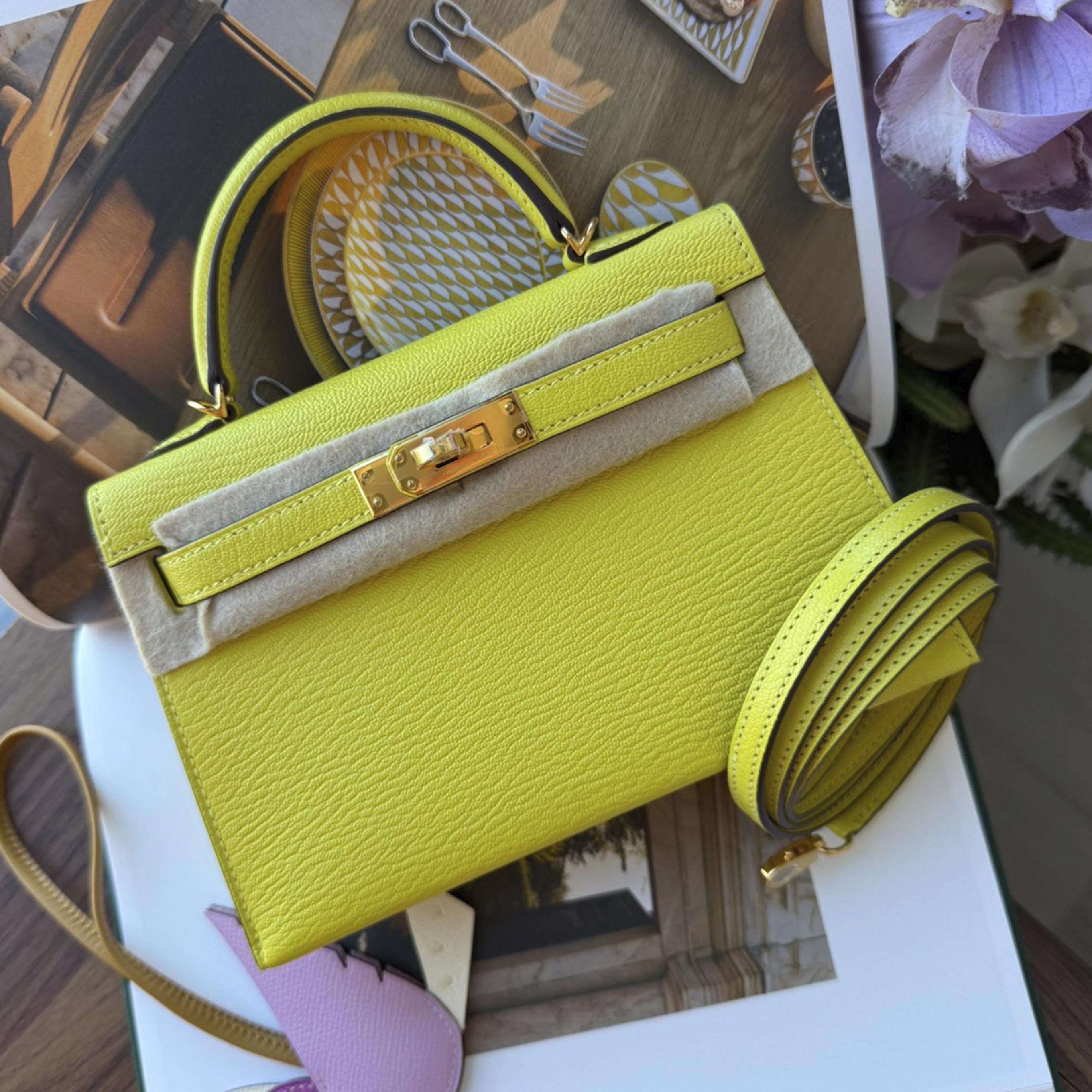Kelly 20 Mini HSS Lime/Gris Perle Inside Chevre Gold Hardware Stamp K