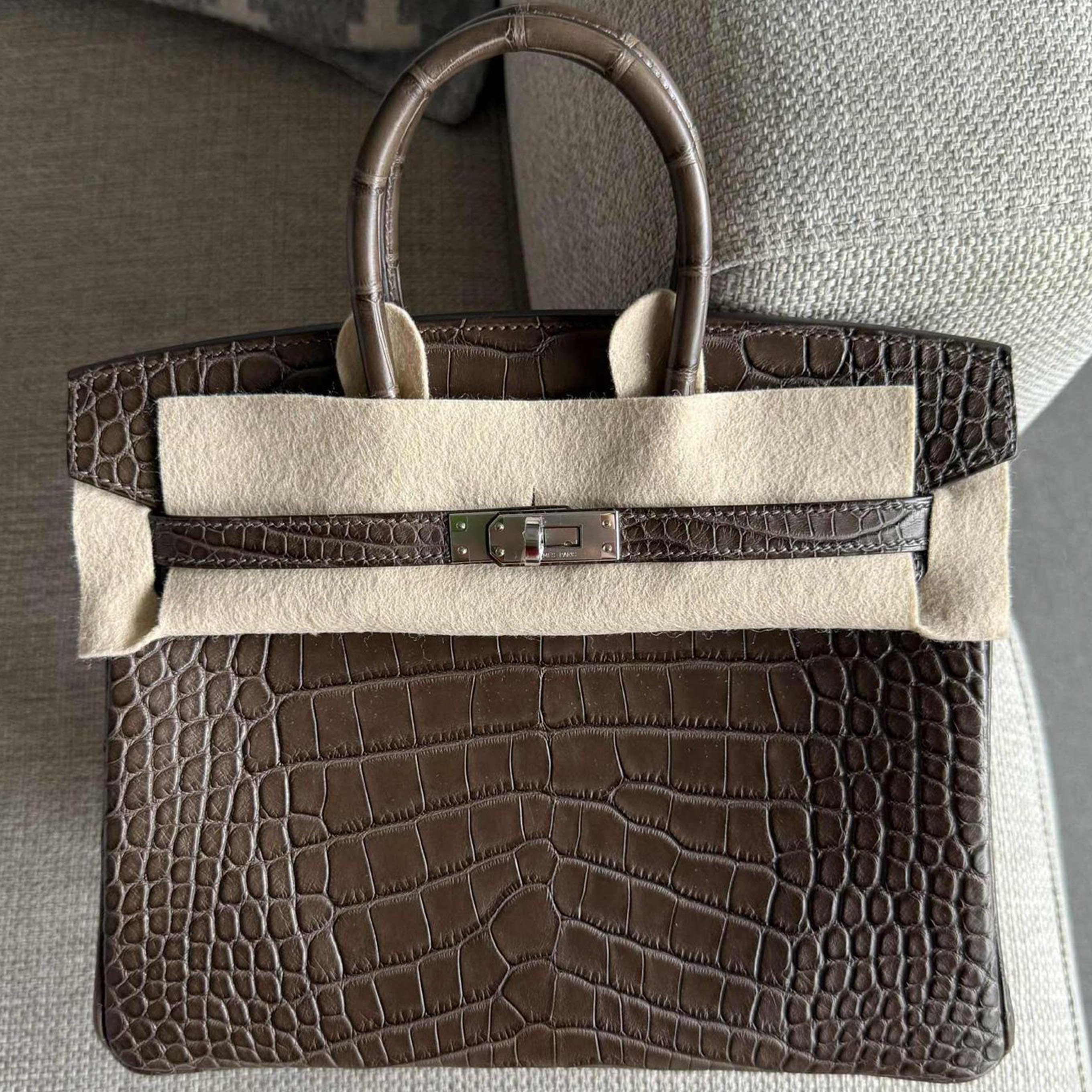 Birkin 25 Gris Elephant Alligator Palladium Hardware Stamp K