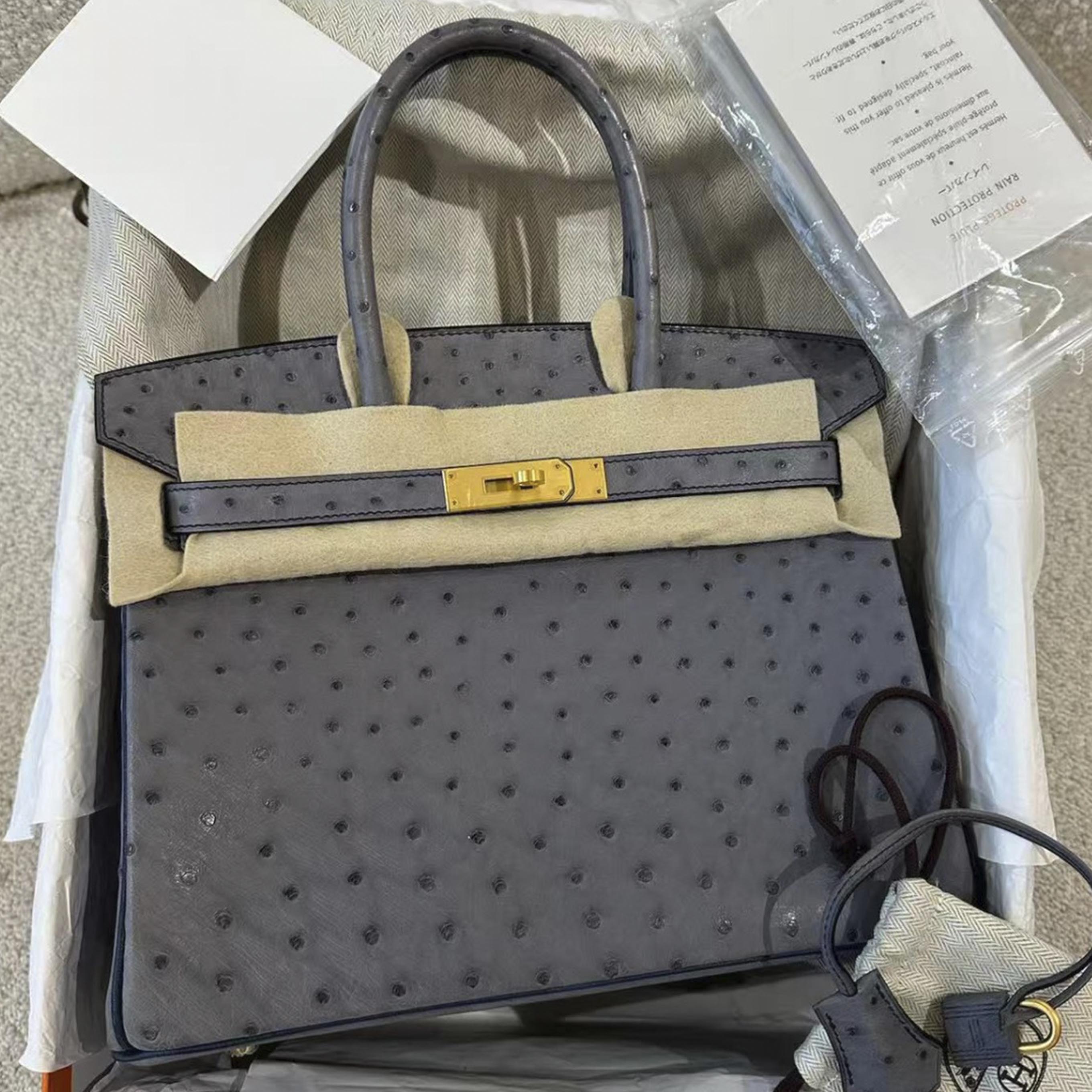 Birkin 30 HSS Gris Agate/Deep Blue Ostrich Gold Hardware Stamp D