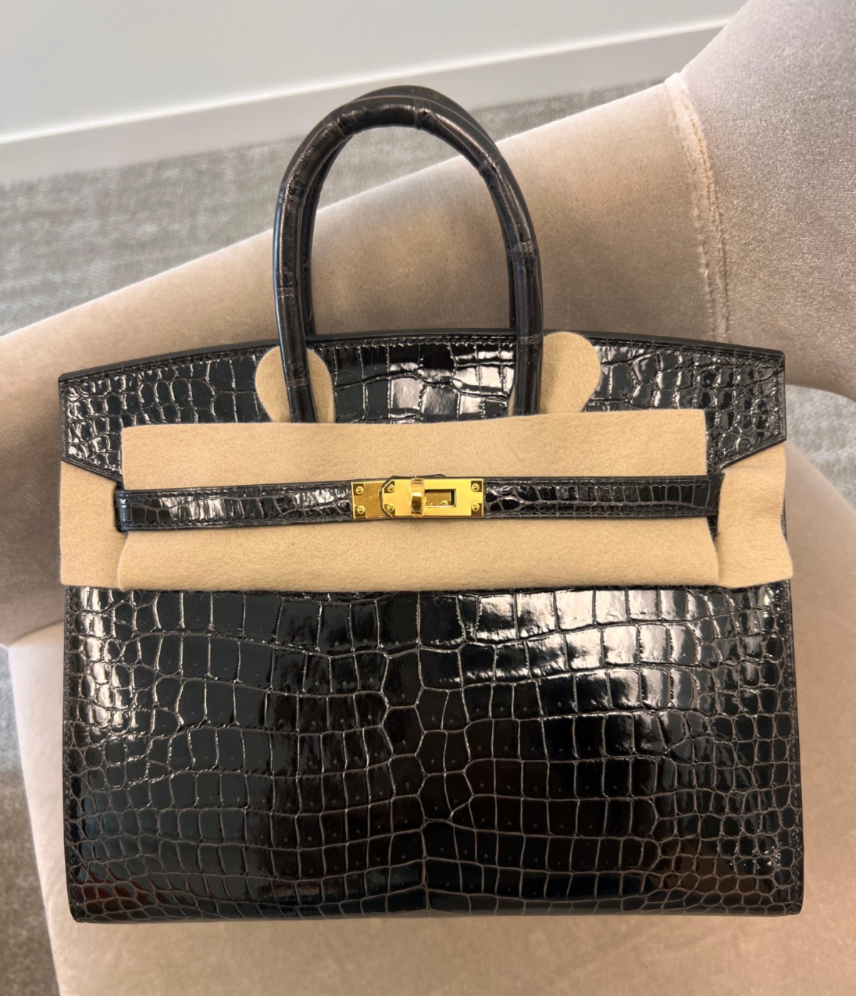Birkin 25 Gris Graphite Porosus Crocodile Shiny Gold Hardware