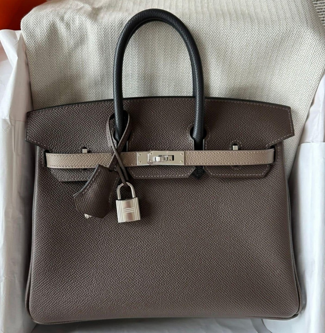 Birkin 25 Tricolor Ecorce Etoupe Black Epsom Palladium Hardware Stamp W