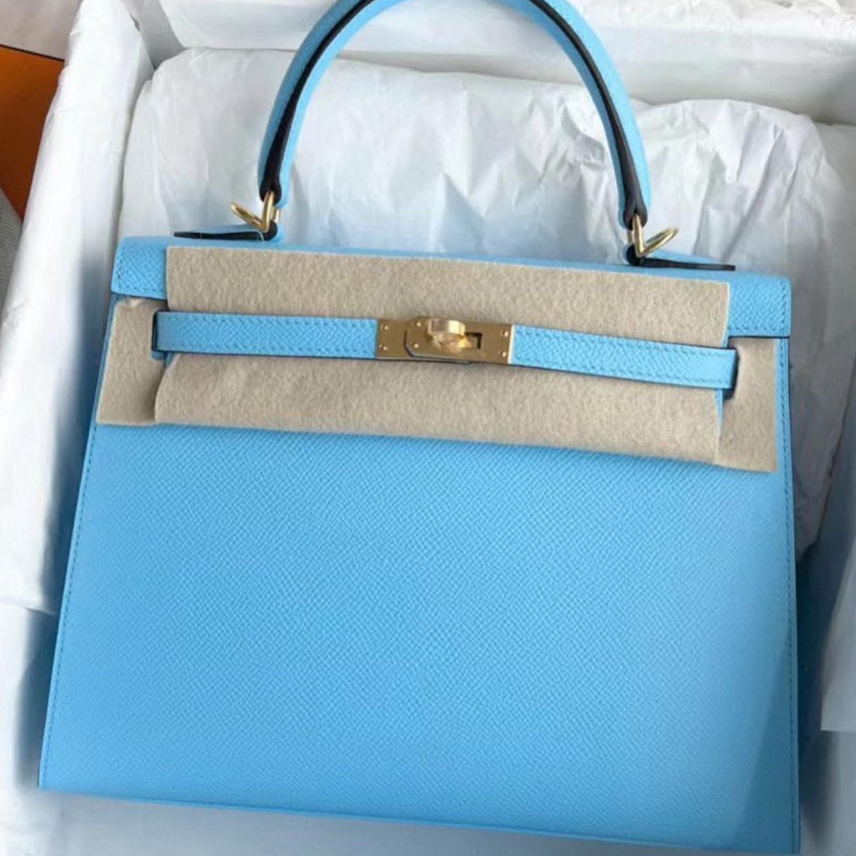 Kelly 25 Celeste Epsom Gold Hardware Stamp U