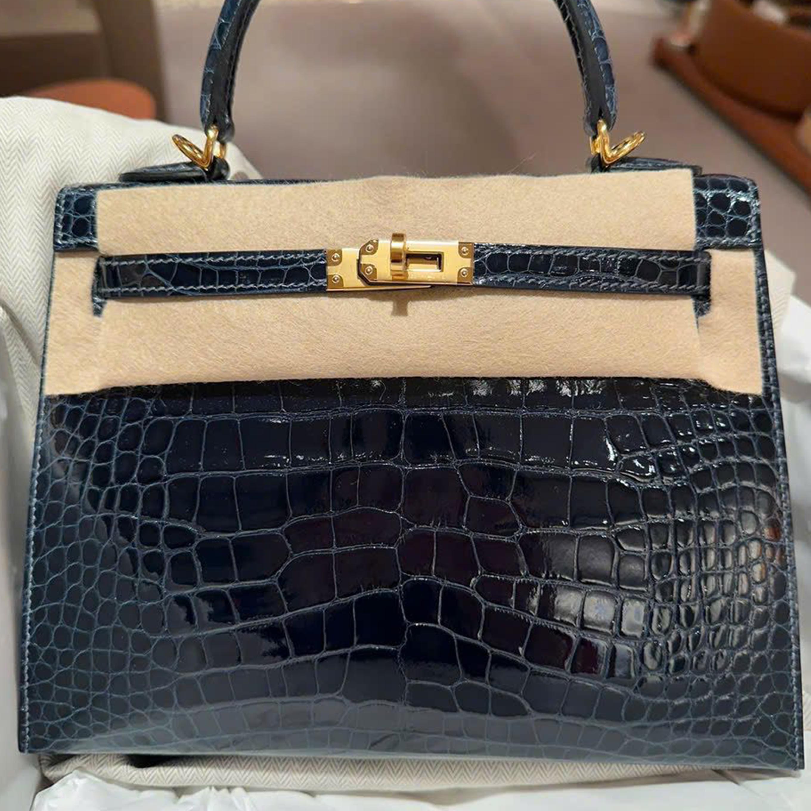 Kelly 25 Blue Baltique Shiny Alligator Gold Hardware Stamp K