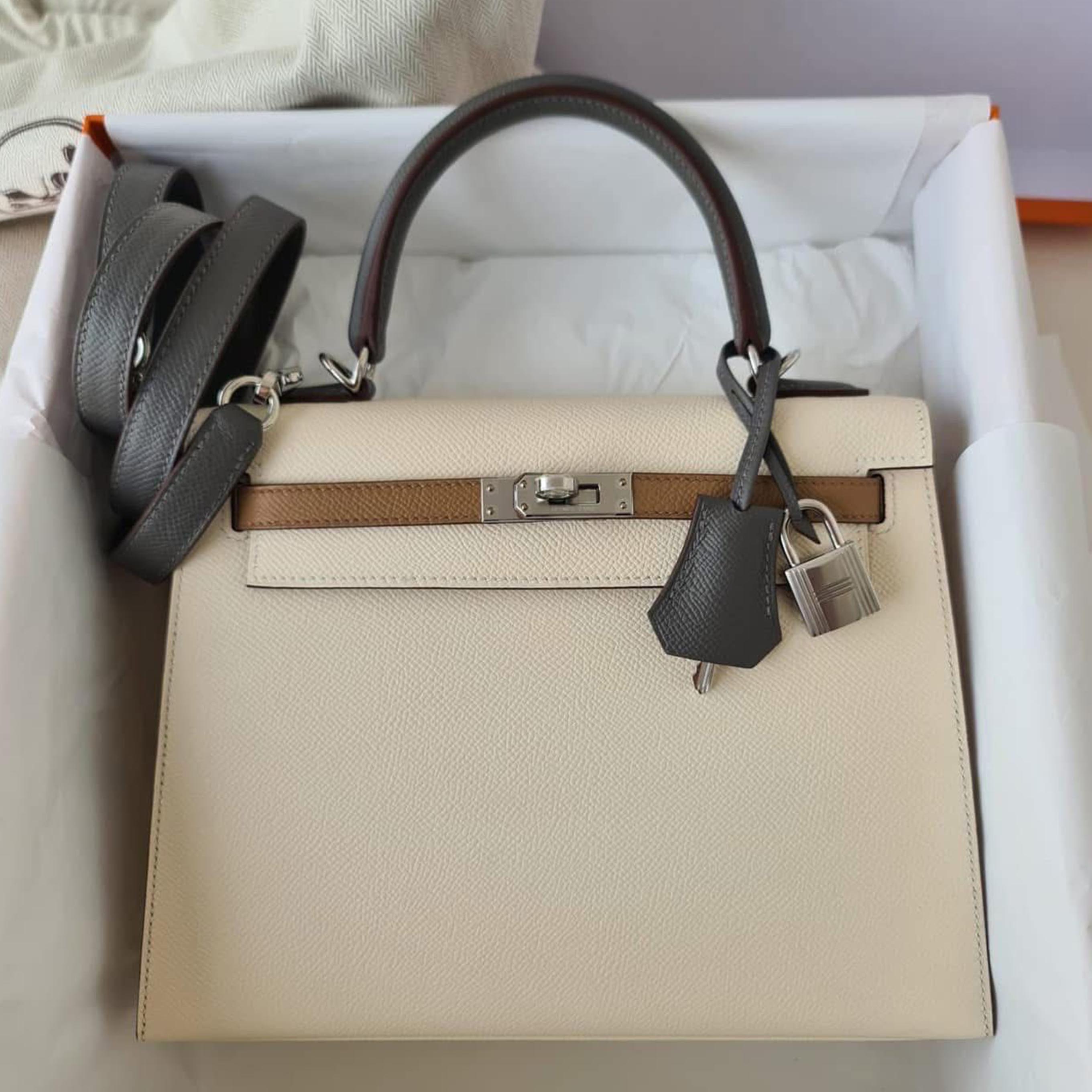 Kelly 25 Tricolor Nata/Gris Meyer/Chai Palladium Hardware Stamp K